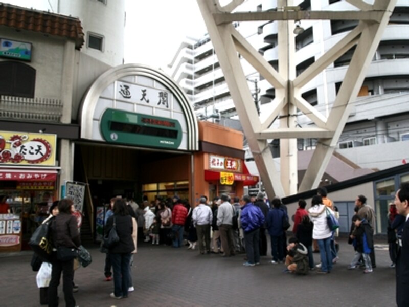 | これが通天閣の入口。週末は大人気でご覧の通りの行列までできてます。 |