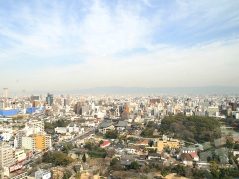 | 通天閣の地上91メートルの展望台からの眺め。手前に見えるんが天王寺公園や一心寺さんで奥にうっすら浮かび上がってるんは生駒山脈。北側方面には大阪市内が一望できて、もちろん太閤はんの大阪城なんかも見えます。なかなかええ景色でっせ! |
