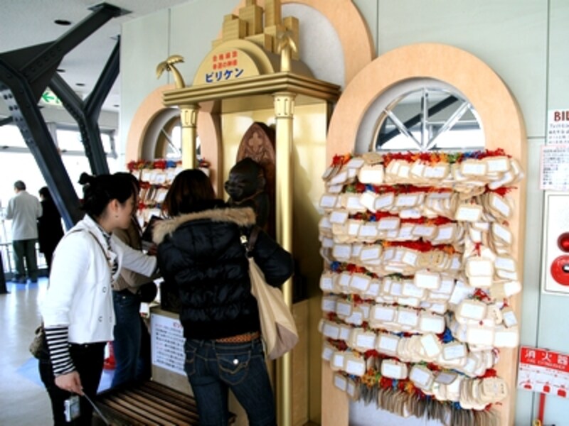 そんな大阪人が愛してやまない通天閣の最大の特色といえば、やはり5階展望台に安置されている幸福の神様・ビリケンさまの存在。ビリケンさまは1908年にアメリカの女流芸術家フローレンス・プリッツが夢の中で登場した神様をモデルにして制作したもので、特徴的なトンガリ頭に釣り目は当時のウィリアム・ハワード・タフト大統領(愛称ビリー)に似ていた事からビリケン(小さいビリーといった意味)と呼ばれるようになりました。