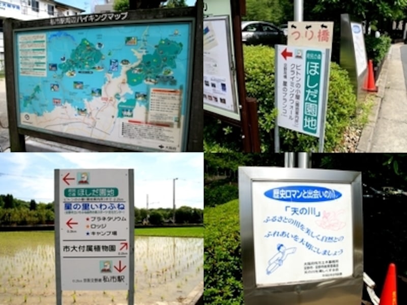 | 人気のハイキングコースとして知られている交野市、私市駅周辺ではあちらこちらにハイキングルートや観光名所の案内板が設置されているので道に迷うこともありません。 |