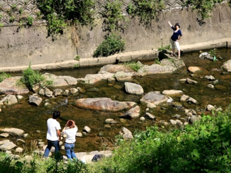 | 「かわぞいの路」で見かけた光景です。天野川ではカップルや友人らのグループ、家族連れの子供たちが大勢集まって川遊びに興じています。 |