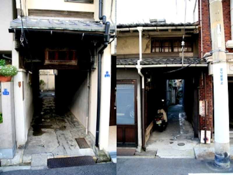 | 空堀名物(?)の「冠木門」(トンネル路地)で奥に見えるのが裏路地です。表通りを歩いていると突如としてこういうトンネル路地が顔を出したりします。昭和レトロ感覚に懐かしさや郷愁を感じますが、これらのトンネル路地は地域住民の生活道路ですので、勝手に入ったり大声で騒ぐといった迷惑行為は慎むようにしましょう。 |