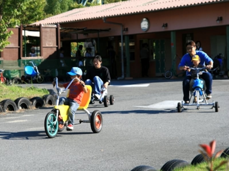 | 「おもしろ自転車」です。コースはサーキット仕立てになっていて、レーサー気取りになった子供たちが「ブンブン!」と叫びながら走っていきます。「二人乗り」や「手で漕ぐ」など自転車の細工や工夫も楽しめます。 |