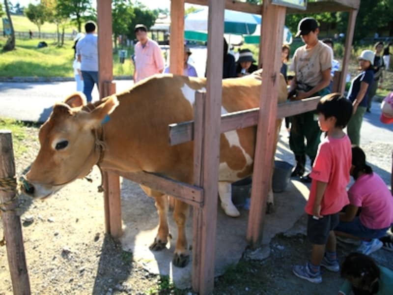 | 大衆の面前で乳を絞られている牛です。無表情ですが、どことなく哀しげな瞳に見えなくもありません。ちなみにぼくは整理券が取れずで乳絞りができませんでした。かえすがえすも残念です。 |