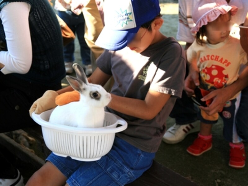 | かごの中にちょこんと入って子供に触られているウサギです。子供たちに慣れているのか、逃げたりあばれたりもせずに時折、鼻をヒクヒクさせます。もこもこして可愛らしいことこの上ありません! |
