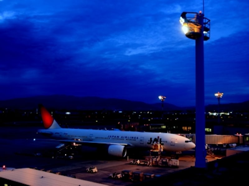 | 大阪国際空港展望デッキ「ラ・ソーラ」から。煌々としたライトに照らされて昼間の空港とはまた違った情緒のある趣きに包まれます。 |