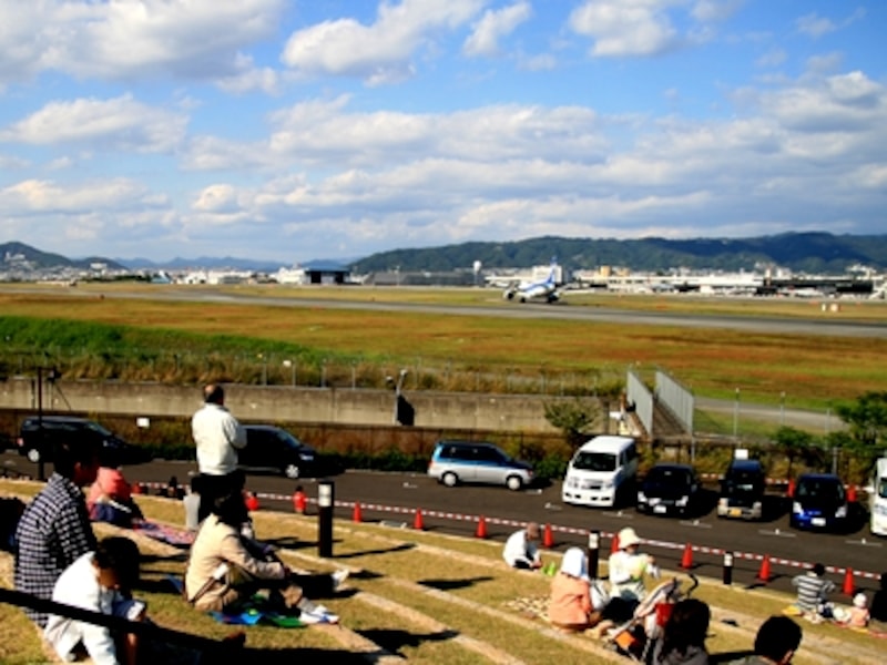 伊丹スカイパークのパークセンターを越えて階段を上ると、まず見えてきたのが「だんだんテラス」。ここは絶好のビューポイントのひとつであるらしく、大勢のレジャー客でにぎわっていますが、背景には大阪国際空港と滑走路が見えて、本当に目と鼻の先でジャンボ機が滑走、離着陸していくことに驚きます。