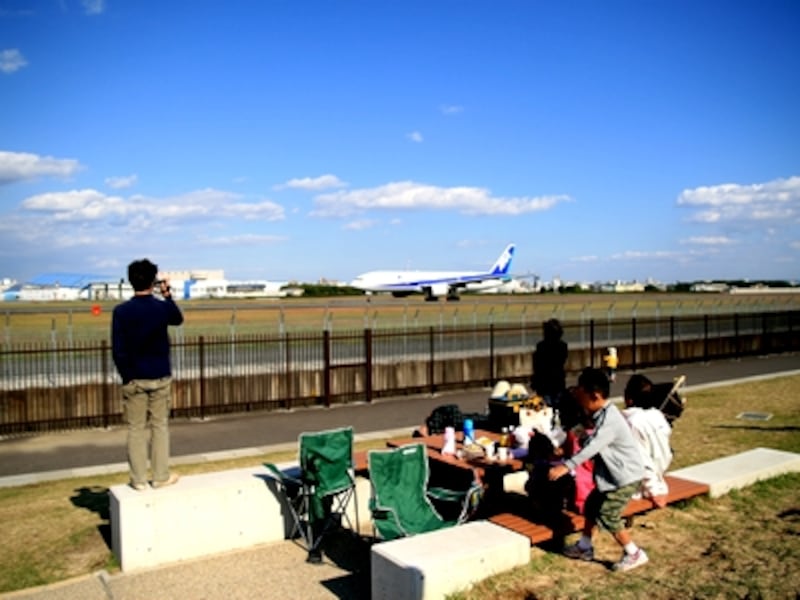 | 芝生の上にテーブル、イスなどが設置されています。大阪国際空港を眺めて楽しめるような憩いの設計になっています。 |