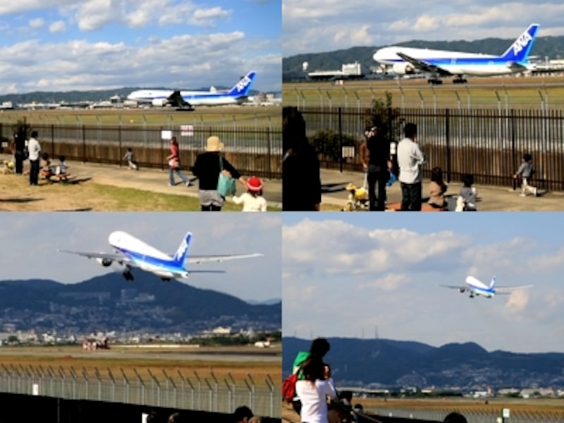 「だんだんテラス」を通り過ぎると次は「多目的広場」に出ます。大阪国際空港には2本の滑走路がありますが、必ず飛行機は一方通行で、南側から北側に向かって離着陸します。発着するさいは多目的広場の目の前を飛行機が高速で滑走していき、轟音を響かせながら「だんだんテラス」辺りで機首を浮上させて大空へと舞い上がっていきます。