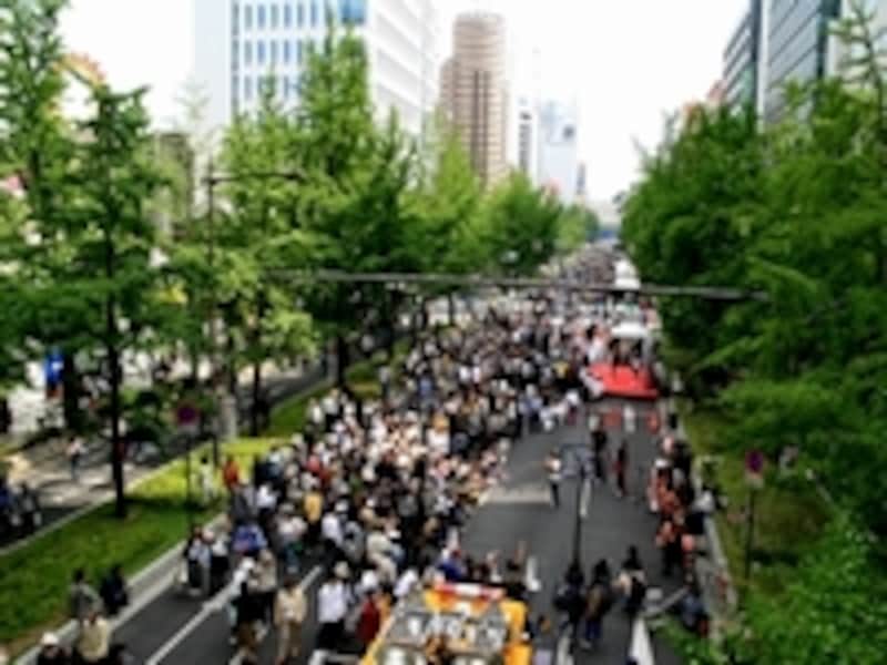 | キタとミナミを結ぶ幅44メートルの幹線道路・御堂筋。地下鉄・御堂筋線が走っています。秋の御堂筋パレードはつとに有名です。 |