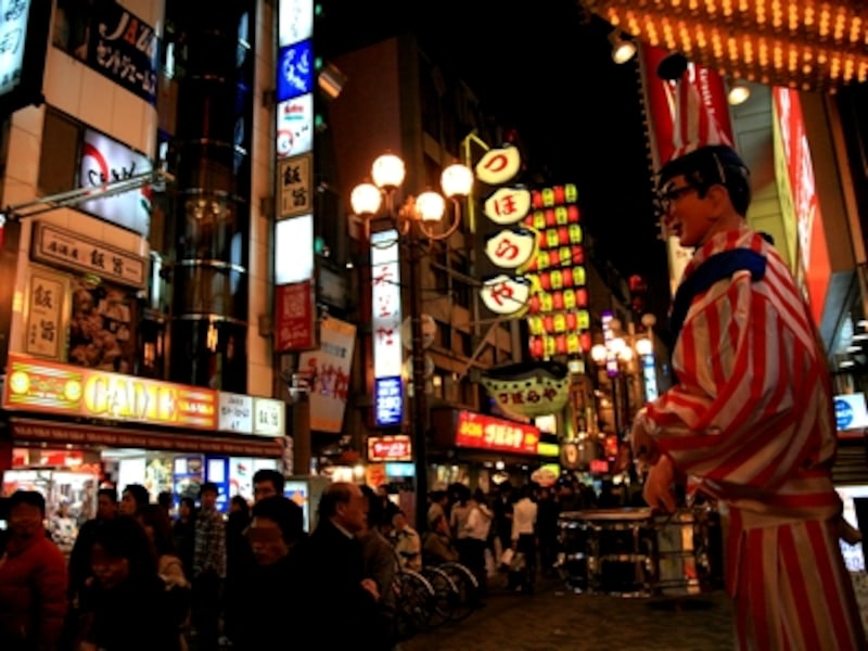 つまり食べて飲んで騒いだ遊び場が発展して町が出来上がったわけで、これが大阪ミナミの最大の特徴です。道頓堀を歩いているとチンドン屋とか陸上選手とかカニとかフグとか、やたらとハデで奇抜な看板が乱れ飛んでいますが、こういうのは遊び心を最優先した結果。ちなみに大阪ミナミの繁華街は集客数では劣るものの面積においては東京の新宿を抜いて日本最大の繁華街であることも付加えておきましょう。