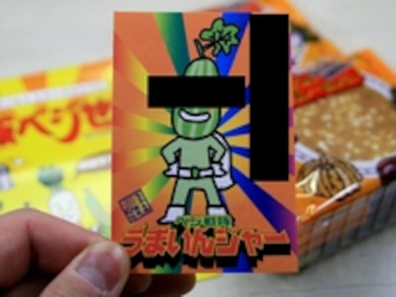 | 「大阪べジせん」(税込525円)のおまけカードです。特別にシークレットカードを見せていただきましたが残念ながら顔出しはNG。一体どんなキャラなのか?知りたい方は大阪べジせんを箱買いしてみてください! |