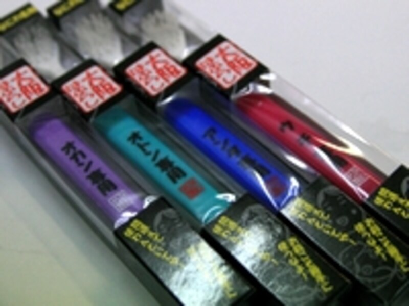 | こちらは「大阪はぶらし」(1本税込420円)。「オトン専用」「オカン専用」「アンタ専用」「ウチ専用」と4種類あります。じつは大阪は歯ブラシ生産のメッカ(国内シェア60%以上)で、大阪が誇る地場産業の1つです。 |