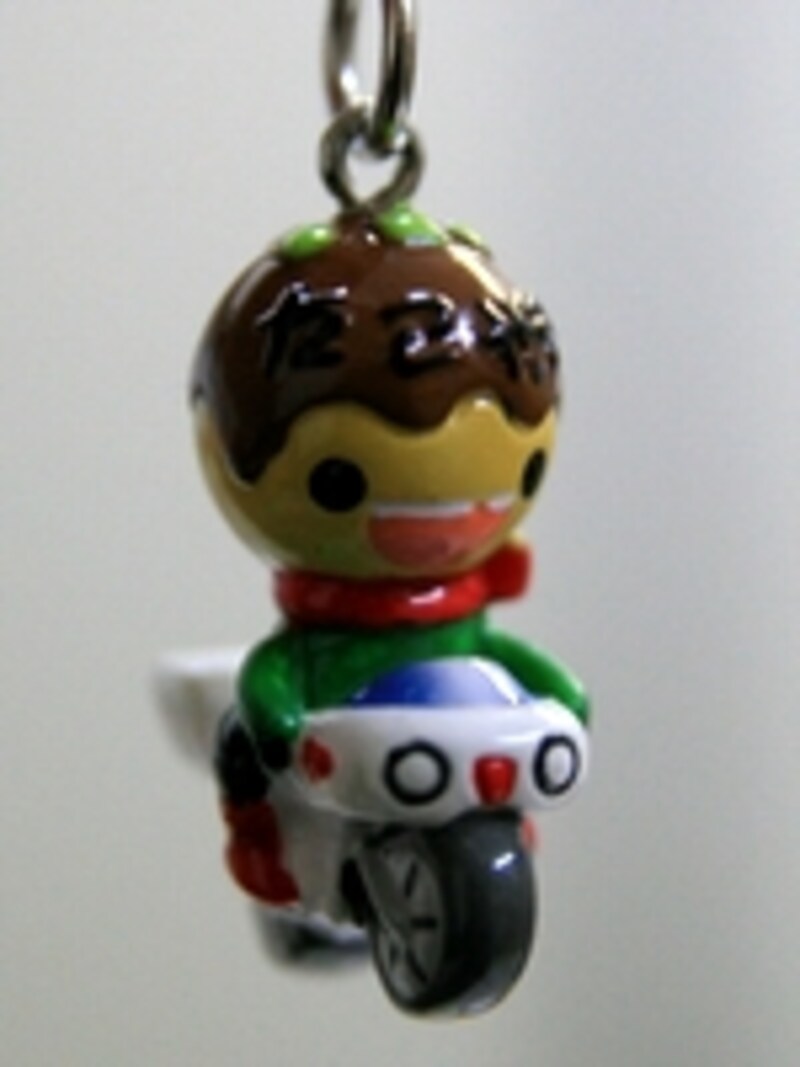 | 最近とくに人気に火がついて売れているのがこちらの「たこ焼きライダー」(税込367円)のキーホルダー。カワイイ「ゆるキャラ」ですね~。 |