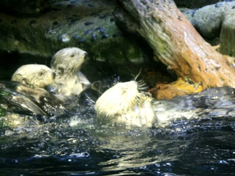 | エサの時間で大はしゃぎのラッコたち。目が輝いてますね…。 |