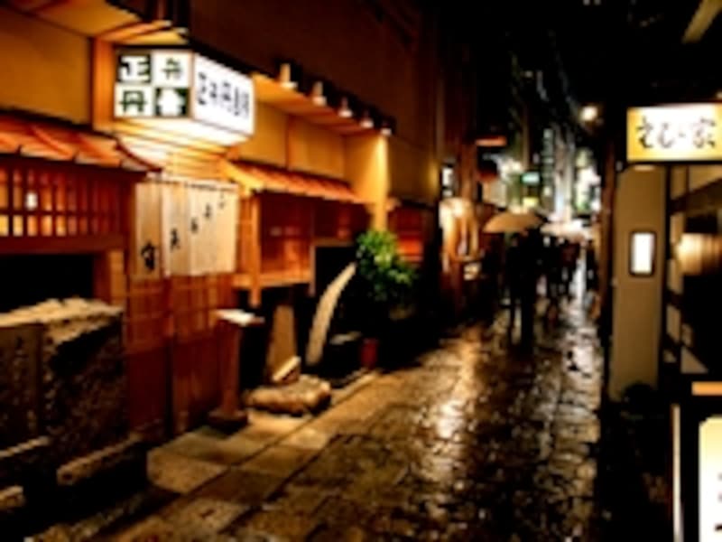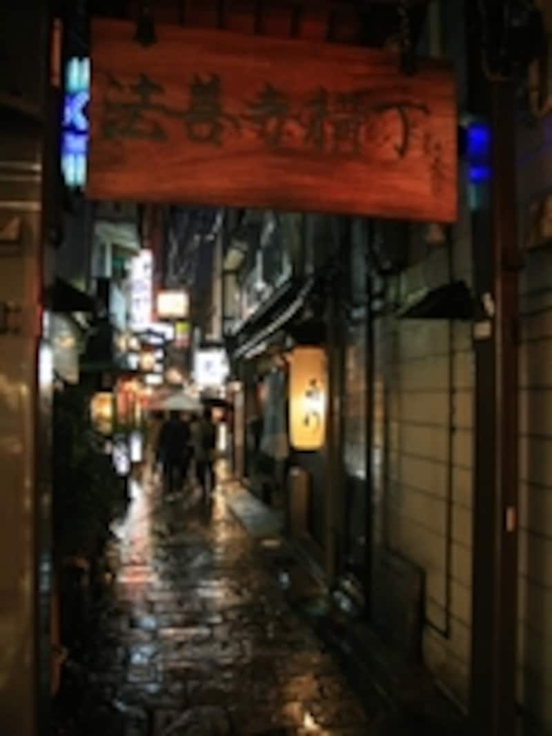 | 石畳が映える雨の法善寺横丁。看板の法善寺横丁の「善」の字に注目です!(隣の赤提灯の「法善寺」の文字と見比べてみると違いがよくわかります。) |