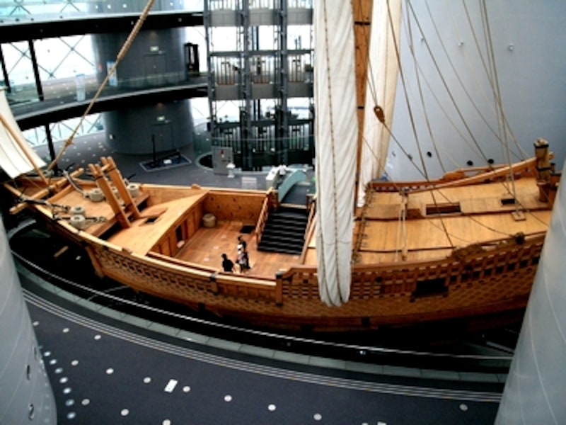 時空館の展示棟に入ったとたんに、目の前に見えてくるのが菱垣廻船の「浪華丸」。国立国会図書館が所蔵する菱垣廻船図面などを参考にして、1999年に実物大で復元されました。復元されたレプリカとはいえ、実際に試験帆走も行われて見事に大成功しています。