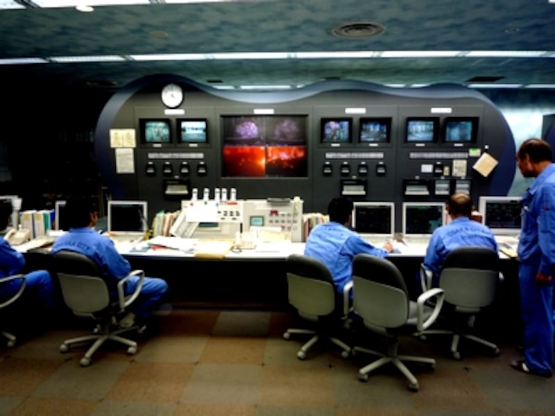 | 舞洲工場のスタッフです。工場内の様子をモニターで確認しています。モニターのデザインにもちょっとしたアートな遊び心が伺えます。 |