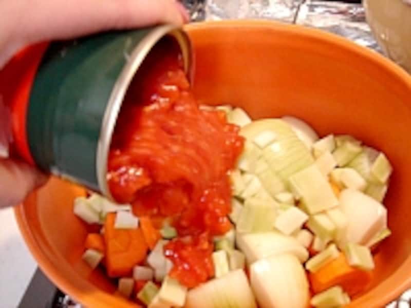 2. トマト缶とコンソメを入れて1と混ぜ合わせ、ローリエを入れてウォーターリッド鍋を弱火にかけます。