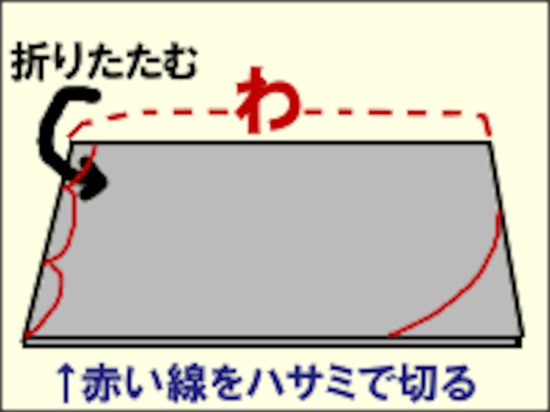 (2)切り取ったものを左右対称になるように2つ折りにして「わ」にして、図のように切り取ります。