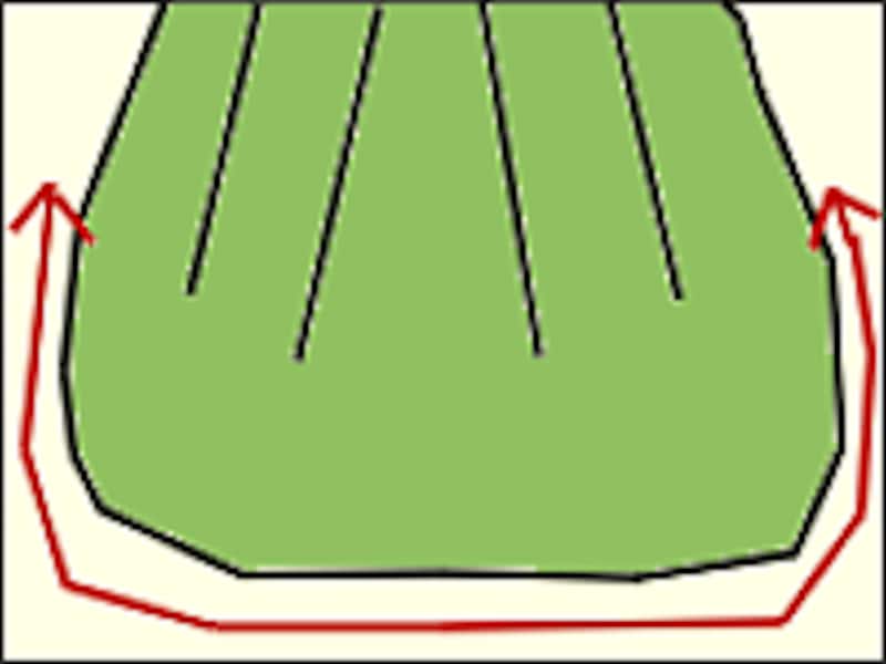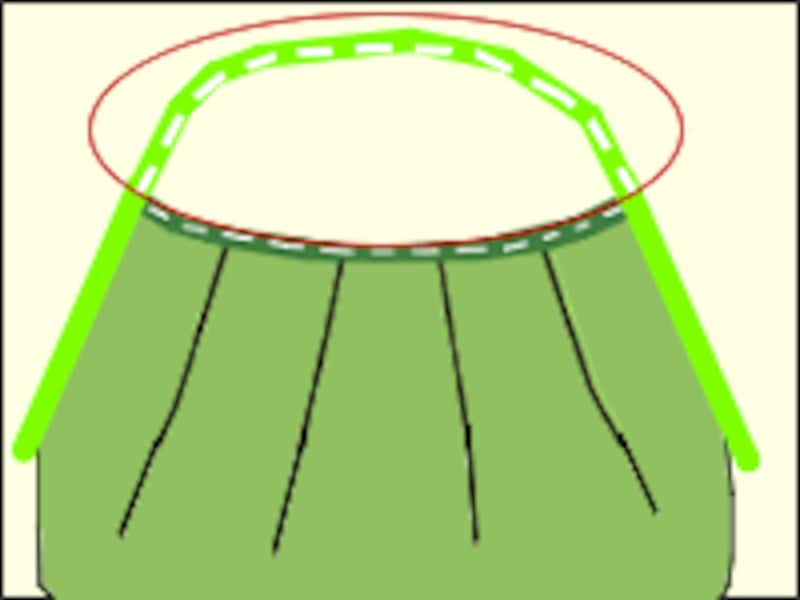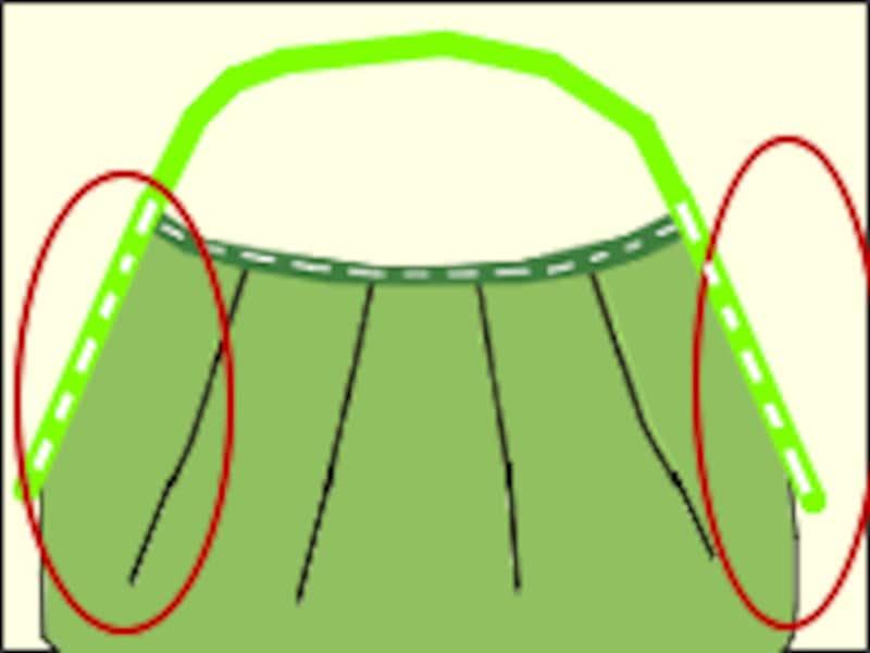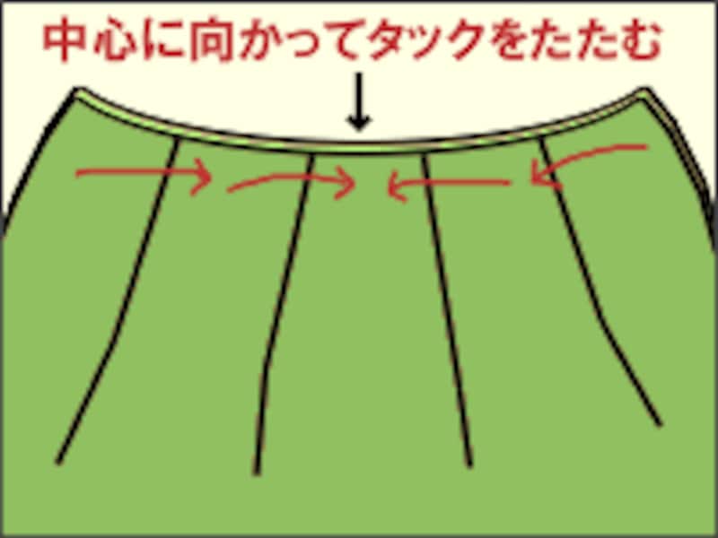 (4)裏表1枚ずつを重ねて一緒にタック(折り目)を作ります。図のように中心に向かってタックを折ると、出来上がりがフワッとして可愛いです。山のとがっている部分をつまんで(裏表一緒に)上のラインに合わせて中心に向かって折り畳めばOKです。待ち針でタックを留め、出来れば「しつけ縫い」をしてください。