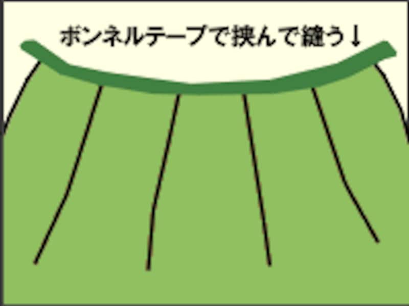 (5)あれば3cm幅位のボンネルテープ(かばんひもみたいなもの)を用意、ボンネルテープで入れ口部分を挟んでミシンで縫います。