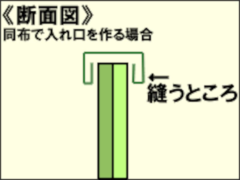 ボンネルテープがない場合は、入れ口部分の長さに合わせた4cm幅の布を用意します(ガイドが作ったものは本体と同じ布で作ってあります)。断面図のように4cm幅を1cmずつ折り合わせてミシンで縫います。