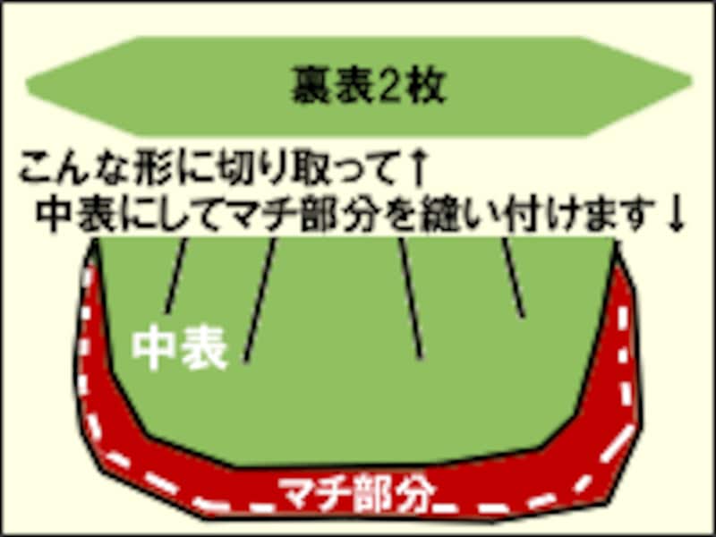 図のような形に布裏表2枚切り、中表にしてマチを縫い付けます(赤い部分がマチですが分かりやすいように赤にしているだけで同じ布でOKです。)。
