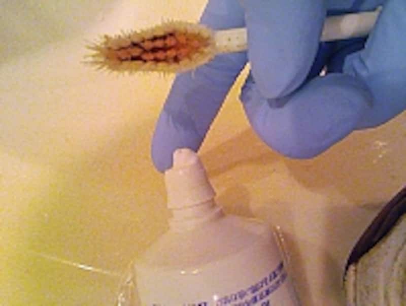 石けんを塗りこみ、ブラシで擦りますが、イマイチ落としきれません。