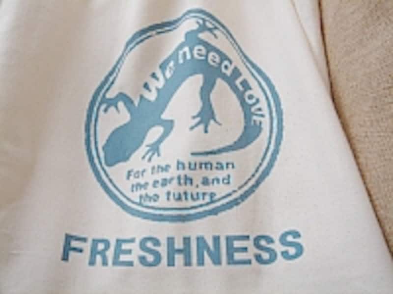 (株)フレッシュネスが、2006年に原宿に第1号店を開店したオーガニック&ナチュラルのマーケット「FRESHNESS NATURAL MARKET」のロゴ、イモリのマークがプリントされていてシンプルで可愛くてインテリアにもなります。