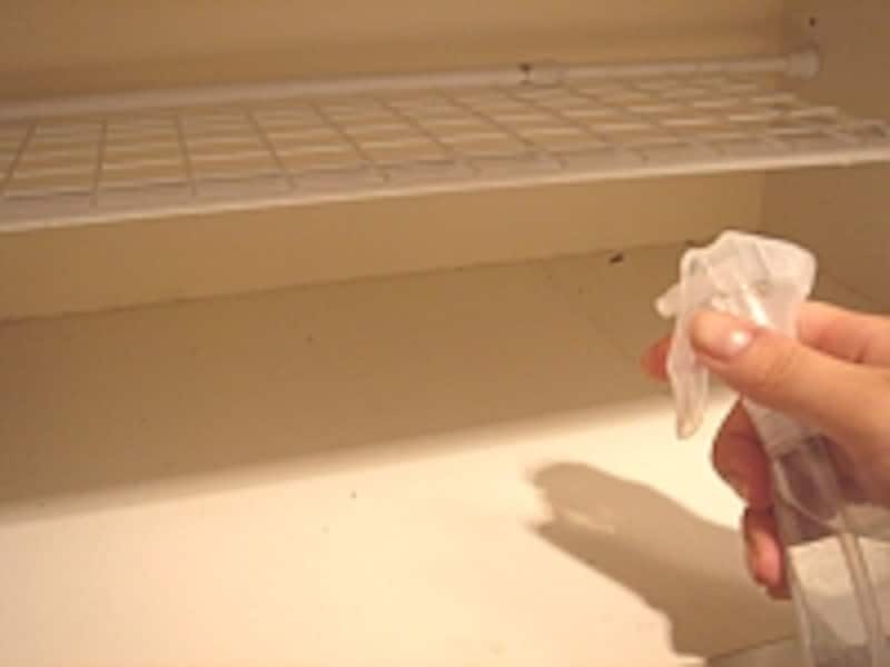 棚が木製で出来ており、水分がしみこむ素材の場合は、ほんの少し水に湿らせた重曹を棚に撒き、掃除機で砂やホコリと一緒に吸い取って、から拭きした方が無難です。