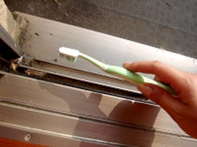 窓ワクは、水が流れるように溝が作られているはずですので、溝に向かって掃き出すようにすると簡単です。