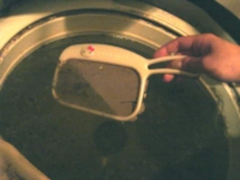 今回は「洗濯機がクサくて…買い換えたい!」という、知り合いの田中さん(仮名)のお宅の洗濯機で体験。20年モノくらいの古い洗濯機(ガイド宅の洗濯機もそうですが汗)で、数年前に1度だけ、市販の洗濯槽用カビ取り剤でカビ取りしてみたところ、全くカビが浮かなかったので「ウチの洗濯槽にはカビがないのかしら」と思ってそのまま使い続けていたそう。