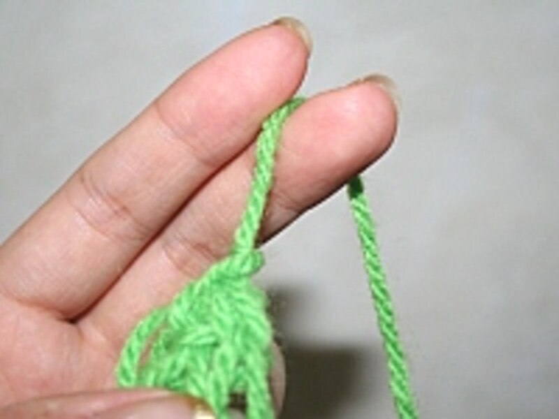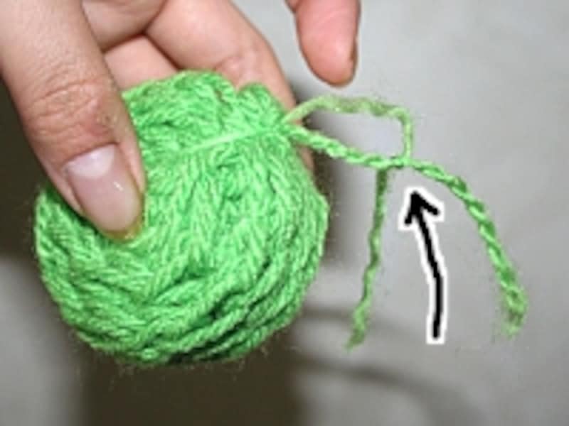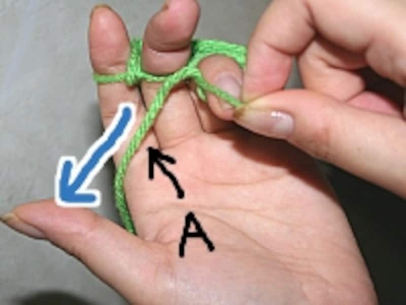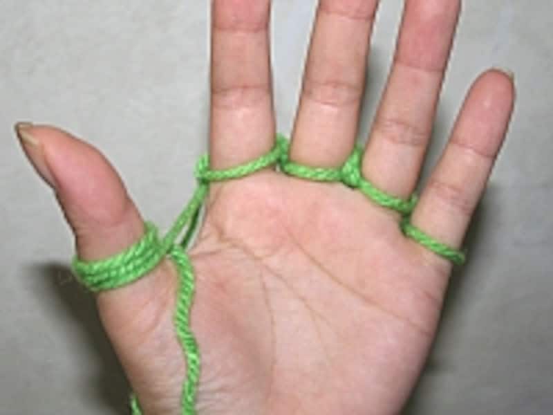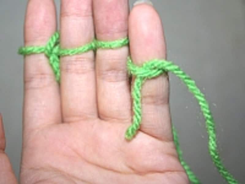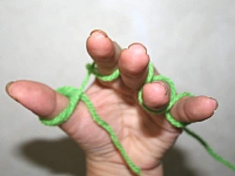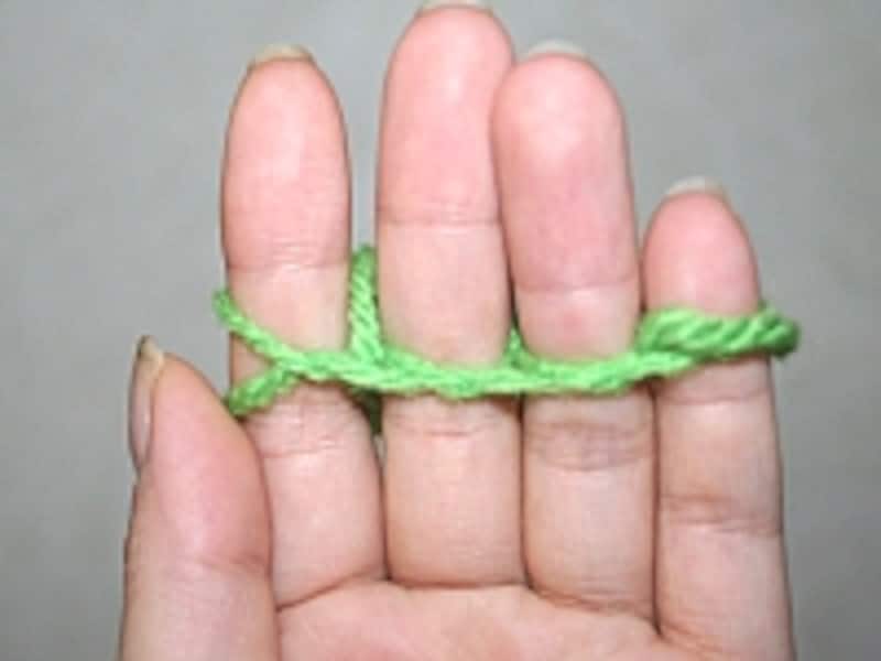 6.指に巻かれている糸を、編まずに渡した糸の下をくぐらせ…