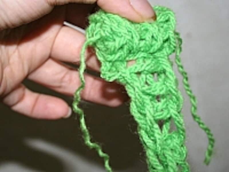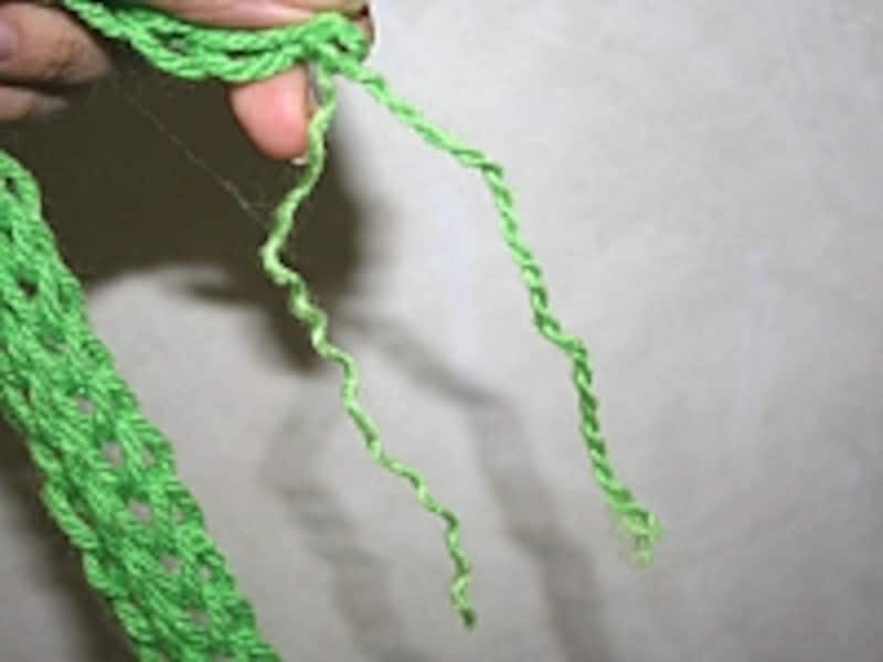 16. 二つに分けた方の糸端を、編み終わりの部分の上で2重結びで結びつけます。
