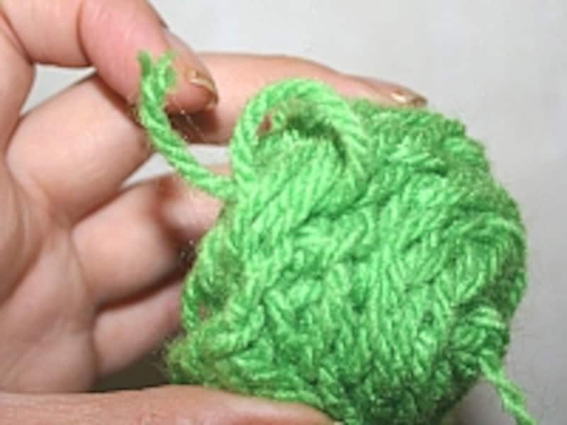12.4本の指から糸を外し、糸端を引っ張り、口を閉じます。アクリルたわしとして使うので、ほどけないように、玉結び等で結んでおいてください。