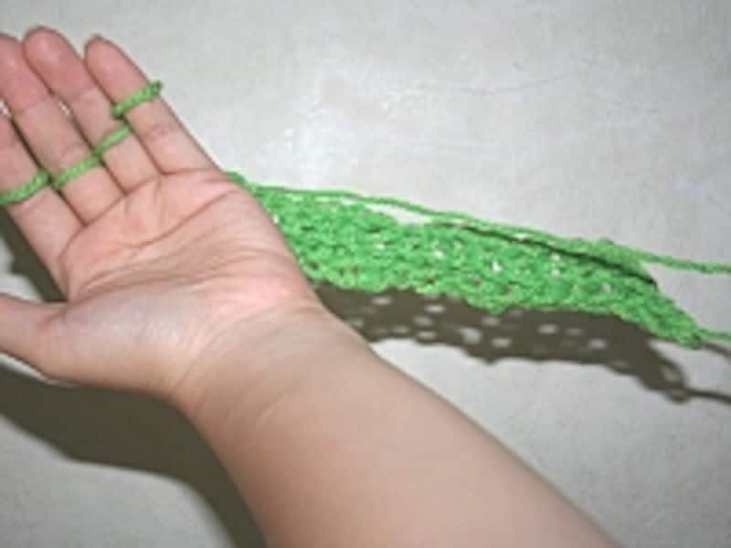 4.人差し指側に来ている編み糸を小指の方まで編まずに渡します。