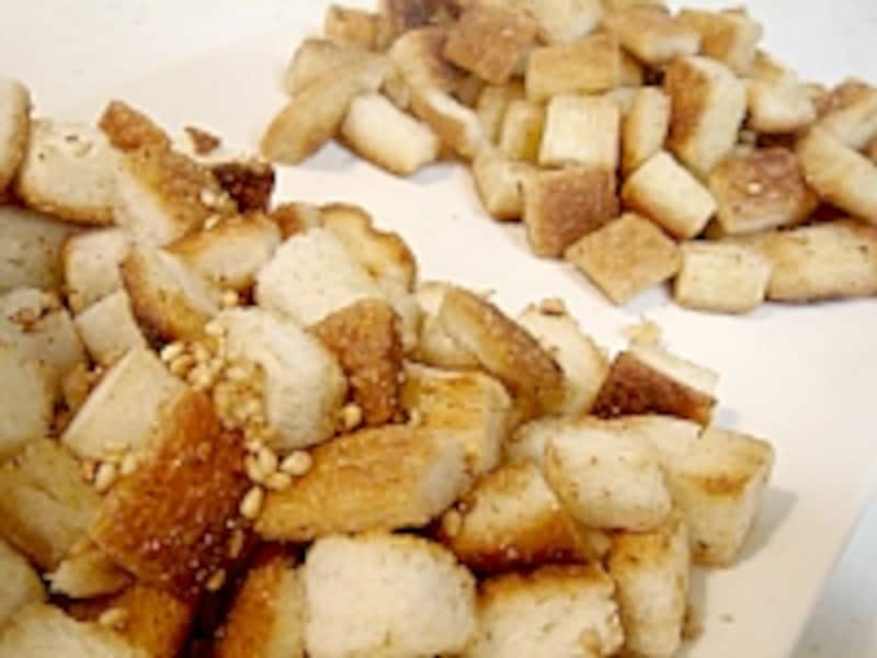 | パン耳は、切り離したら固くなってしまう前に、小さく切り分けておくのがコツ。固くなってから切るとバラバラになりますよー。 |