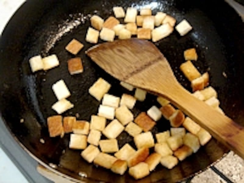バターとオリーブオイル、にんにくをフライパンに入れて、弱火にかけます。バターが溶けたら、パン耳を入れて木ベラなどで混ぜ合わせ、カリッとなるまで炒めます。塩で味付けしてできあがり。