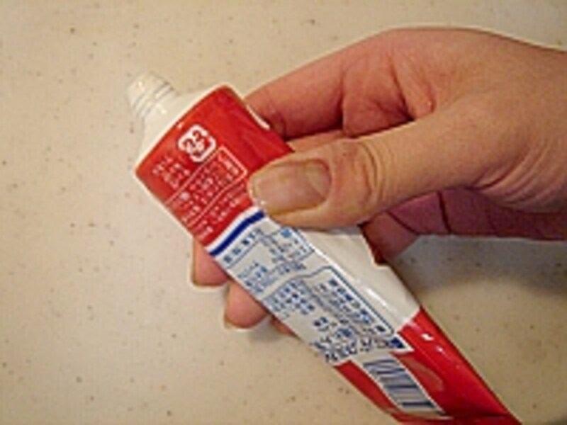 まず、へこんだチューブを、膨らませましょう。チューブの脇の部分を手でペコっと形を戻します。衛生的に気にならなければ、出口の部分の穴から、『フッ』と息を吹き込んで(口はつけない)、完全に膨らませた状態にします。