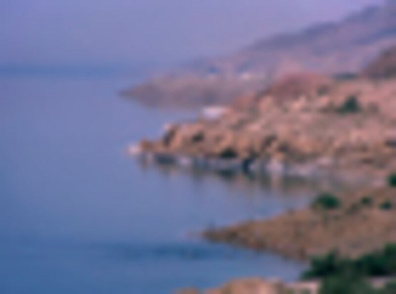 | 死海の海岸線。こちらは死海東岸、ヨルダン側の景色。©牧哲雄 |