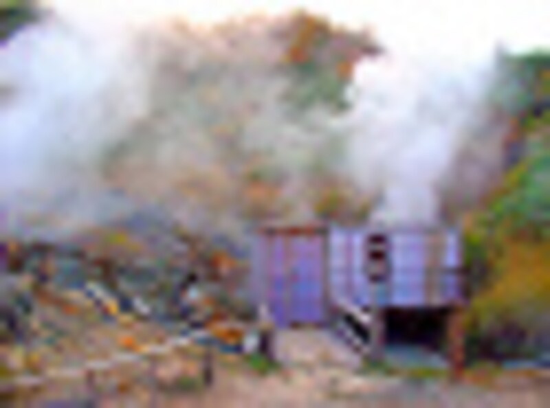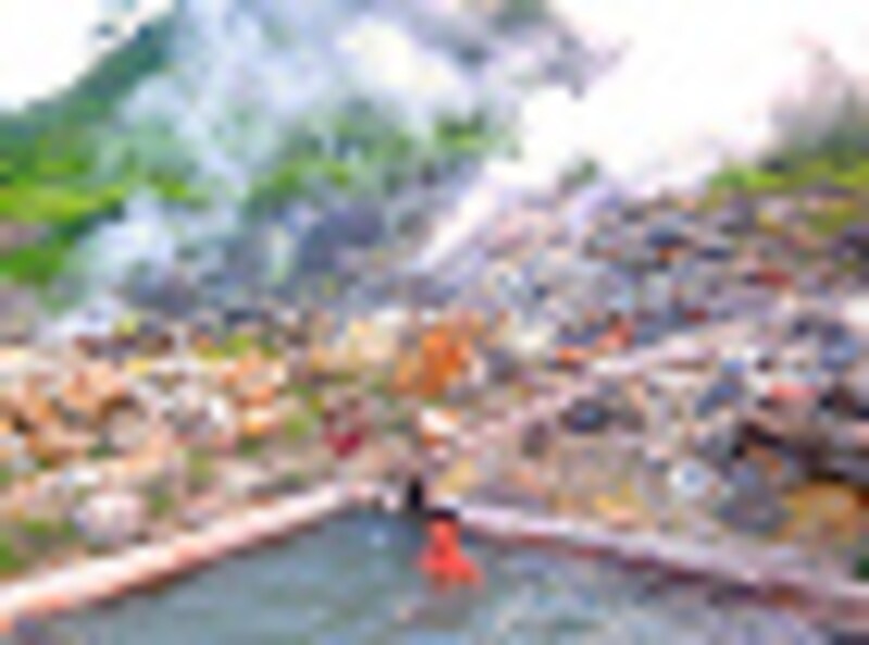 実はふけの湯温泉の露天風呂が、この噴気地帯に点在しているのです。この写真の角度では見えませんが、左手に宿があり、そこで料金を支払って浸かります。噴気地帯にあって、究極のワイルドさを感じる露天風呂群を、早速紹介します!