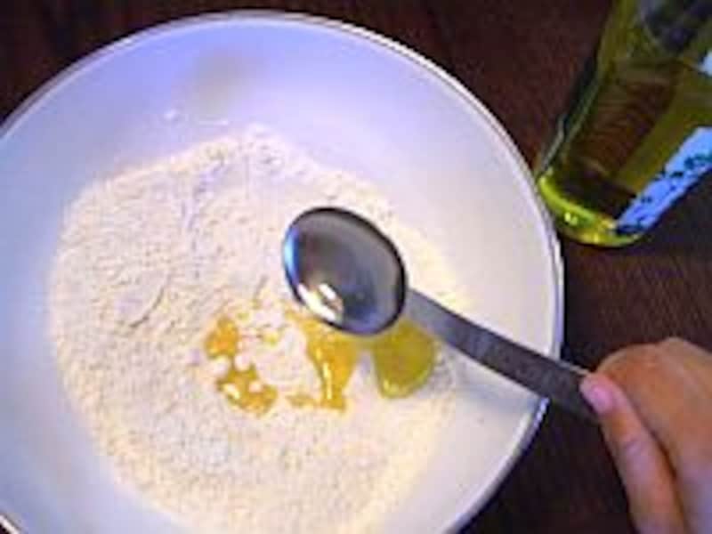 1. First make the dough. Put flour, olive oil and salt in a large bowl.