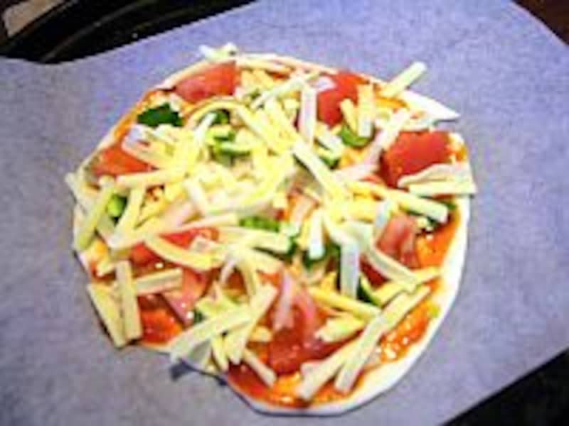 7. Add pizza sauce, onions, tomatoes, green peppers and shredded cheese.