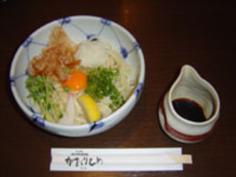 | 釜揚げうどんに生卵や薬味をたっぷりのせて、ダシをかけて食べる「釜卵生醤油うどん」。これが讃岐地方独特の食べ方 |