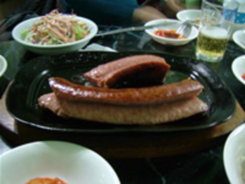 | ブデチゲのほかに特大ソーセージなどサイドメニューもぜひ。ソーセージはカリカリでジューシー |