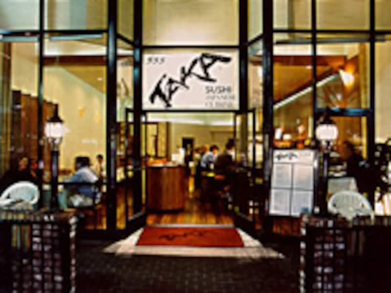 ガラス張りの店内は、オープンで明るい雰囲気でs。板前さんは日本人ですが、日本の渋いお寿司屋さんとはだいぶ趣が違います。テーブル席から通りを眺めるのも楽しいし、カウンターで板前さんの手さばきを見ながら食べるのもいいですね。