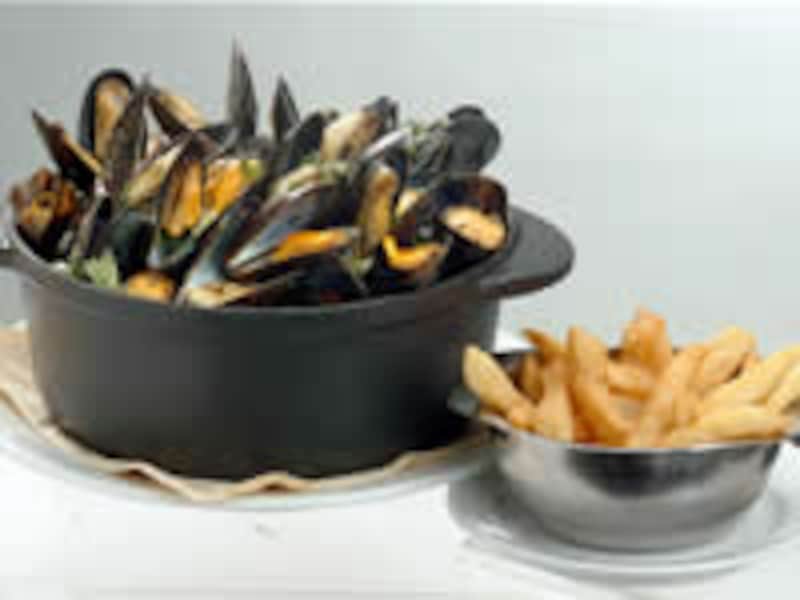 | ムール貝の和名はムラサキ貝。英語ではmussel(s)、フランス語はmoule(s)。付け合せの定番はフリッツ (C)Chez Léon |