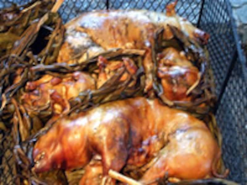 | 現在では金属製の網を使うが、昔は食べ物をバナナの葉でくるんでいた |