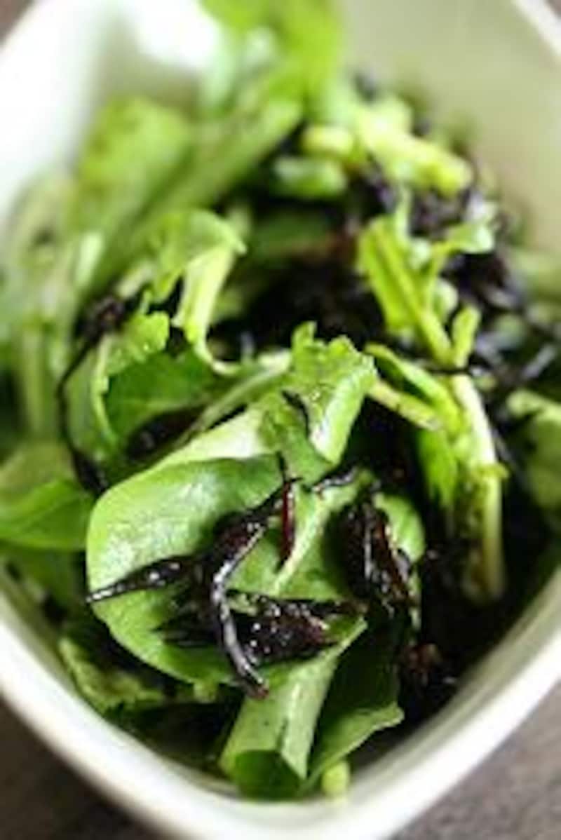 | オリーブオイルとにんにくを温めた鍋に戻した芽ひじきに加えて炒め、塩コショウでしっかり調味。 | ひじきにビネガーをきかせてルッコラとあわせたサラダにアレンジしてもgood! |
